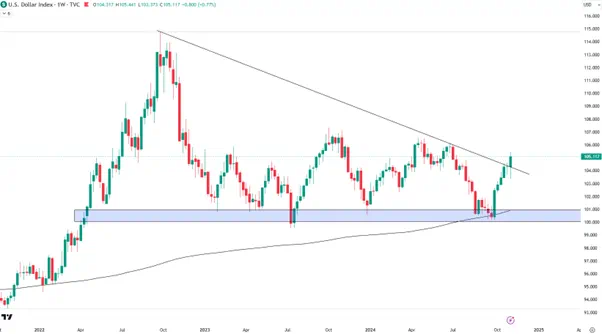 对美元指数来说,周线图上突破意味着多头将目标瞄向106-107的前高区域。