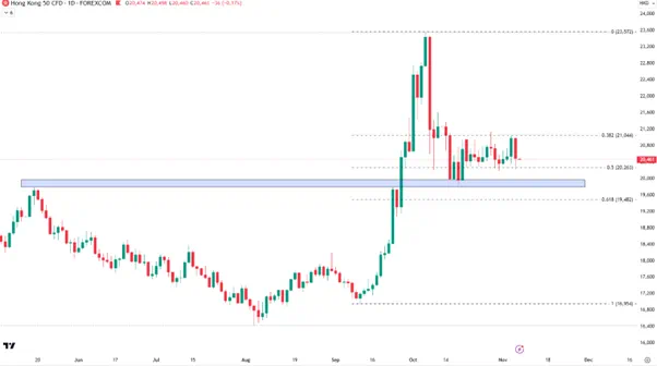 若周五公布细节符合甚至超出预期,HK50指数有望向上突破10月初以来的整理区间。反之,20000点将成为下方的首要支撑参考。