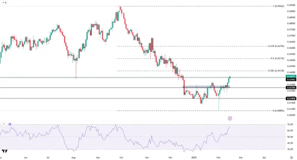 降息的决定可能短暂打压反弹初期的澳元,下方继续关注0.6280一线。若降息预期落空或鹰派降息,澳元有望延续上行,首要目标为0.64109-2月跌幅的38.2%回撤位。