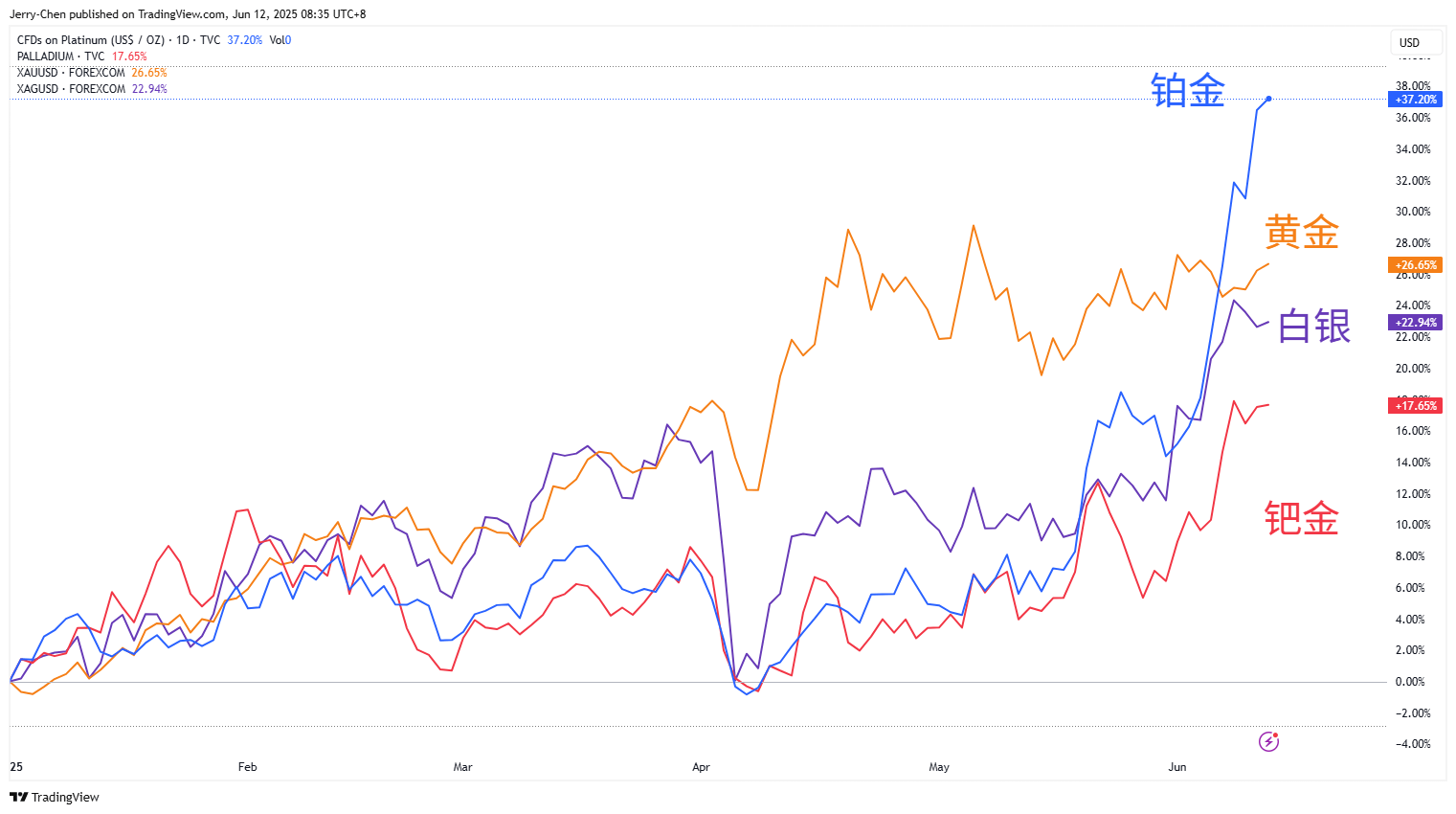 黄金隔夜升至3355美元,白银则连续第二天高位调整收低于36.25美元。不过近期表现最亮眼的当属铂金,单日上涨4.3%创四年新高,过去5个交易日累计上涨12%,全年涨幅更是达到了惊人的39%,远超黄金和白银!