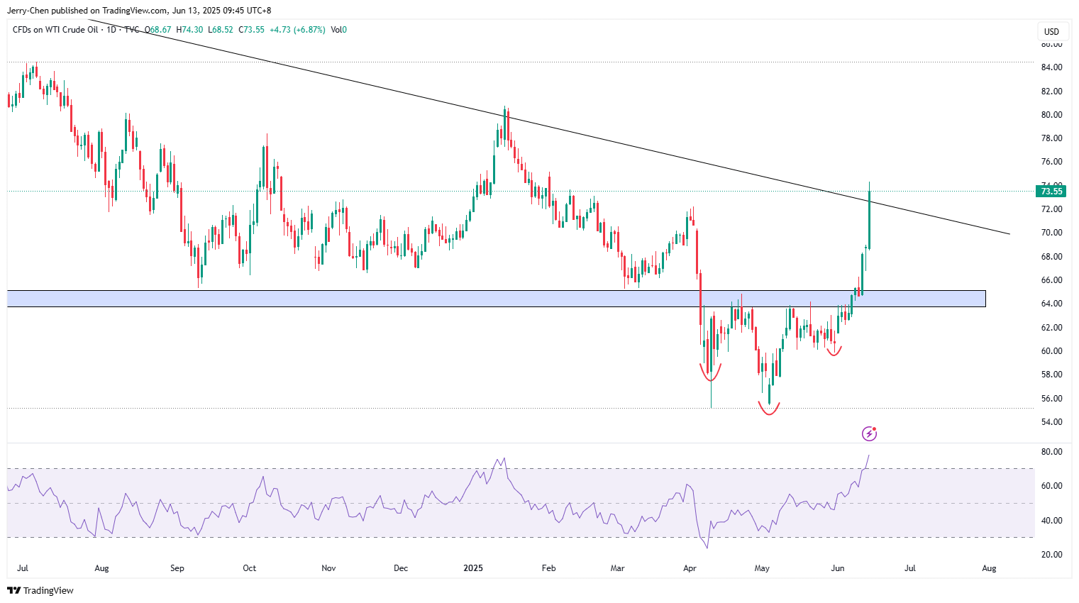 74美元一线是2022年以来的下降趋势线所在的阻力,但当前的宏观环境和短期的上涨动能意味着多头有望继续向80美元发起挑战,若伊朗采取报复措施或加速油价上行。